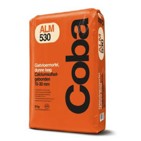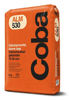 Coba gietvloermortel ALM 530 is geschikt voor het gieten, repareren en aanhelen van calciumsulfaatgebonden dekvloeren in laagdiktes van 15 tot ca. 30 mm. Coba gietvloermortel ALM 530 is speciaal bedoeld voor renovaties, overlagingen en andere situaties waar een minimale laagdikte vereist is. Coba gietvloermortel ALM 530 is geschikt voor deskundig geïnstalleerde vloerverwarming. De stookschema’s voor ingebruikname moeten worden nagekomen. De vloerverwarming kan al na 24 uur opgestart worden. Coba gietvloermortel ALM 530 is zelfnivellerend en huidvrij waardoor schuren niet noodzakelijk is. Coba gietvloermortel ALM 530 heeft een zeer snelle sterkteontwikkeling, is beloopbaar na 12 uur en bijzonder krimp- en spanningsarm. Coba gietvloermortel ALM 530 is machinaal te verpompen. Coba gietvloermortel ALM 530 moet met een vloerafwerking worden bekleed.