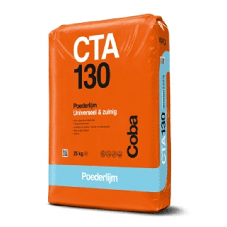 Coba CTA130 poederlijm universeel & zuinig is geschikt voor het binnens- en buitenshuis verlijmen van wand- en vloertegels op alle gebruikelijke ondergronden, zoals beton, cementdekvloeren, kalkzandsteen, cement- en gipsgebonden pleisterwerk, cellenbeton, gipsblokken, gipskarton- en gipsvezelplaten, bouw- en isolatieplaten. Coba CTA130 is geschikt voor vloerverwarming, heeft een goed vullend vermogen, een lange open tijd en is toepasbaar in droge en natte ruimten.