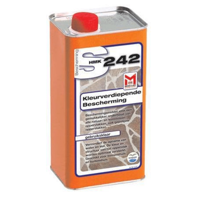 HMK S242 Kleurverdiepende bescherming 1 liter is een gebruiksklaar, speciaal impregneermiddel. Door de impregnering wordt binnendringen van water en vuil voorkomen. Geschikt voor alle soorten natuursteen (zachte en harde gesteenten), marmercomposiet, kunststeen en terrazzo binnen- of buitenshuis. Ook geschikt voor gepolijste oppervlakken. De kleur en structuur van het oppervlak worden optimaal benadrukt door de kleurverdiepende werking.