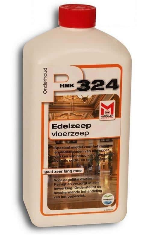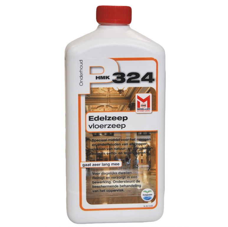 HMK P324 Edelzeep -vloerzeep- is een milde alkalische, neutrale onderhoudsreiniger met speciale, natuurlijke onderhoudscomponenten. Door regelmatig gebruik wordt het oppervlak mooier. De natuurlijke kleurstructuur wordt verdiept en geeft het oppervlak een warm onderhouden aanzicht. Het oppervlak wordt merkbaar vuilafstotend en ongevoeliger voor vlekken. De vloer wordt onderhoudsvriendelijker in het gebruik. Alle bestanddelen zijn en blijven in water oplosbaar, daardoor bouwt HMK P324 Edelzeep -vloerzeep- geen laagjes op. De opbouw van grijze kalkzeepresten wordt door gebruik van speciale grondstoffen vermeden. Bevat: tensides, natuurzeep, conserveringsmiddel, geurstoffen.