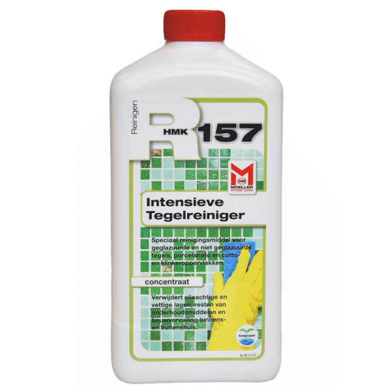 Met Moller HMK R157 Intensieve tegelreiniger kunt u resten van onderhoudsmiddelen en vettige / olieachtige lagen verwijderen. Zeer effectief op ongeglazuurde tegels. Ook goed toepasbaar op geglazuurde tegels, porcelanato, cotto-, baksteentegel-, kleitegel- en klinkeroppervlakken. Zowel voor binnen- en buitenshuis geschikt. Gepolijste oppervlakken worden niet aangetast. Verbruik c.a. 10 – 80 m2/liter.