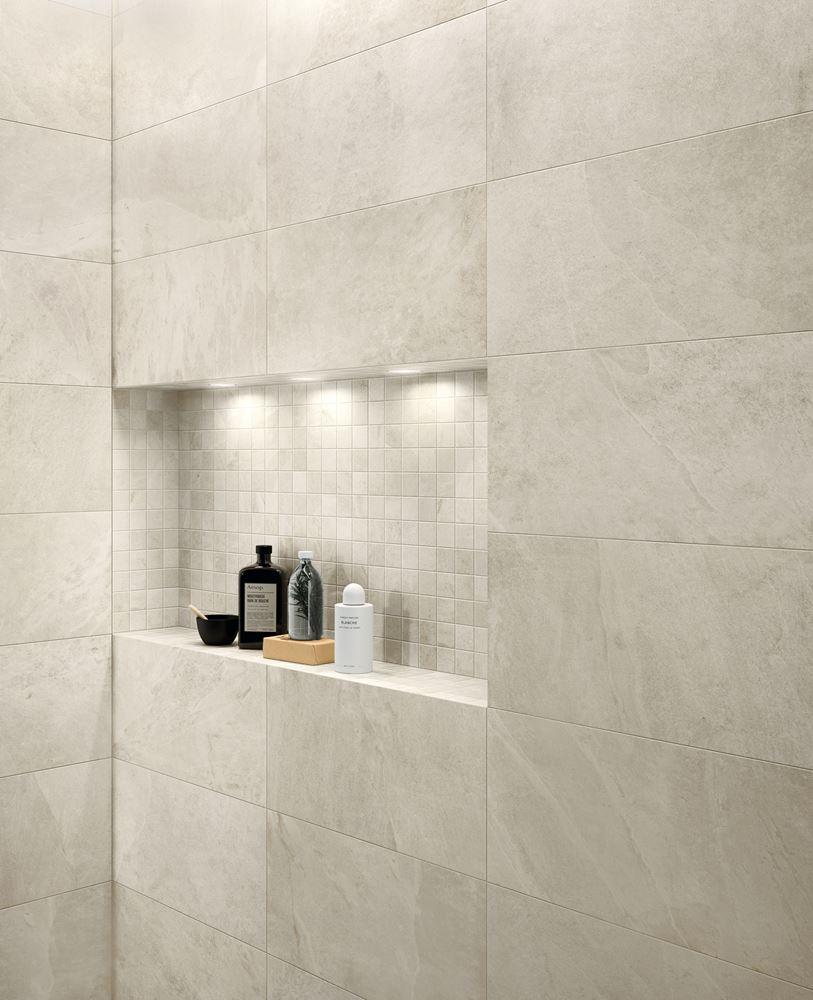 Natuursteenlook tegels hebben tijdloze uitstraling, waardoor deze breed toepasbaar zijn. Ook voor in de woonkamer is deze tegelstijl zeer geschikt.